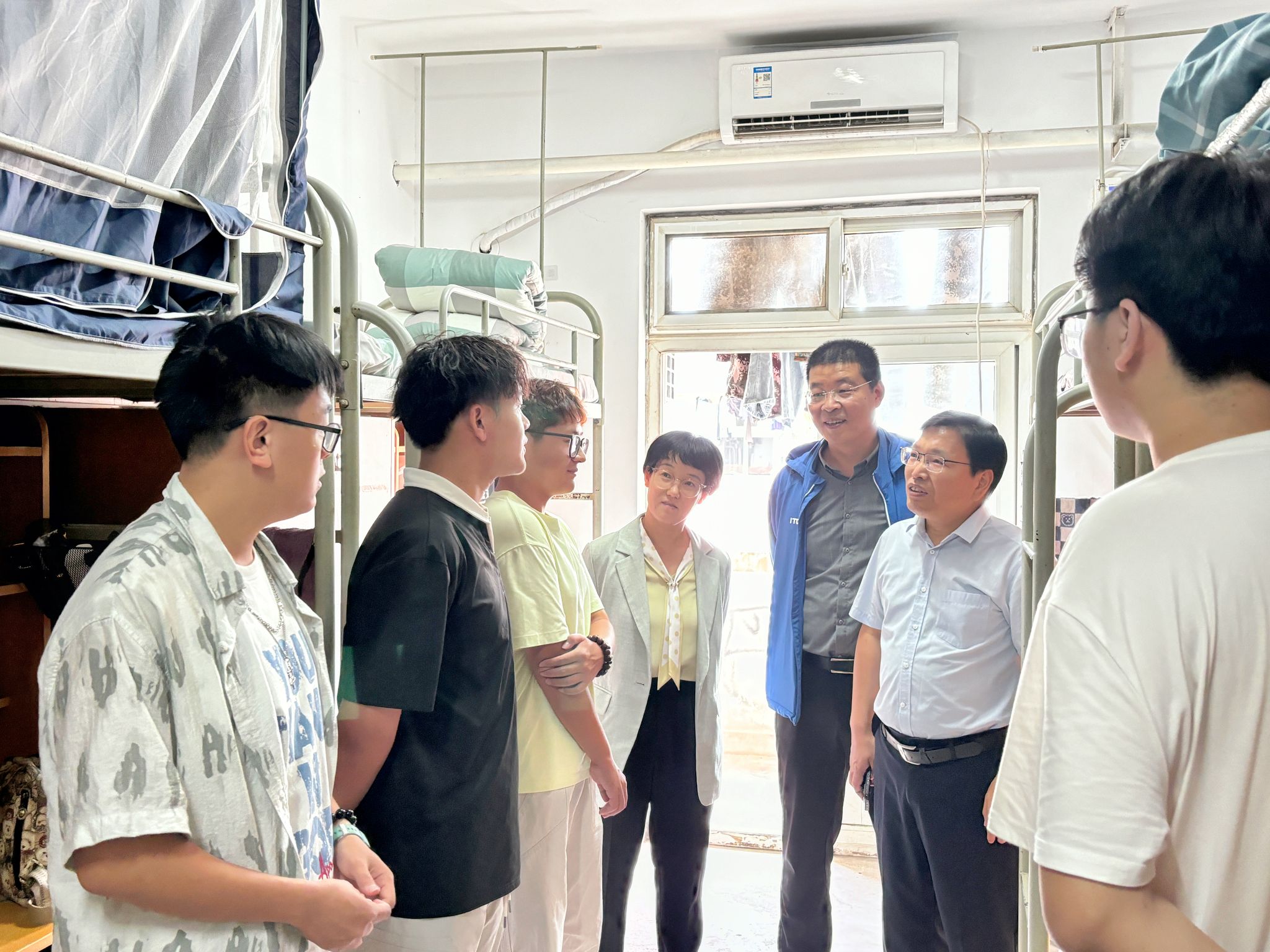 8月31日上午,为深入了解新生入学后的思想动态与生活适应情况,加强安全教育,密切师生联系,传递学院温暖,学院党委书记李喜峰、党委副书记赵立涛和学工办主任、新生辅导员杜静走进2025级新生宿舍,开展暖心走访与慰问活动。走访期间,太阳集团领导与新生进行了深入交流,详细询问同学们入校后的生活适应情况,并叮嘱大家积极调整心态,增强安全防范意识,适应新的学习节奏和生活环境,尽快完成从中学生到大学生的角色转变。