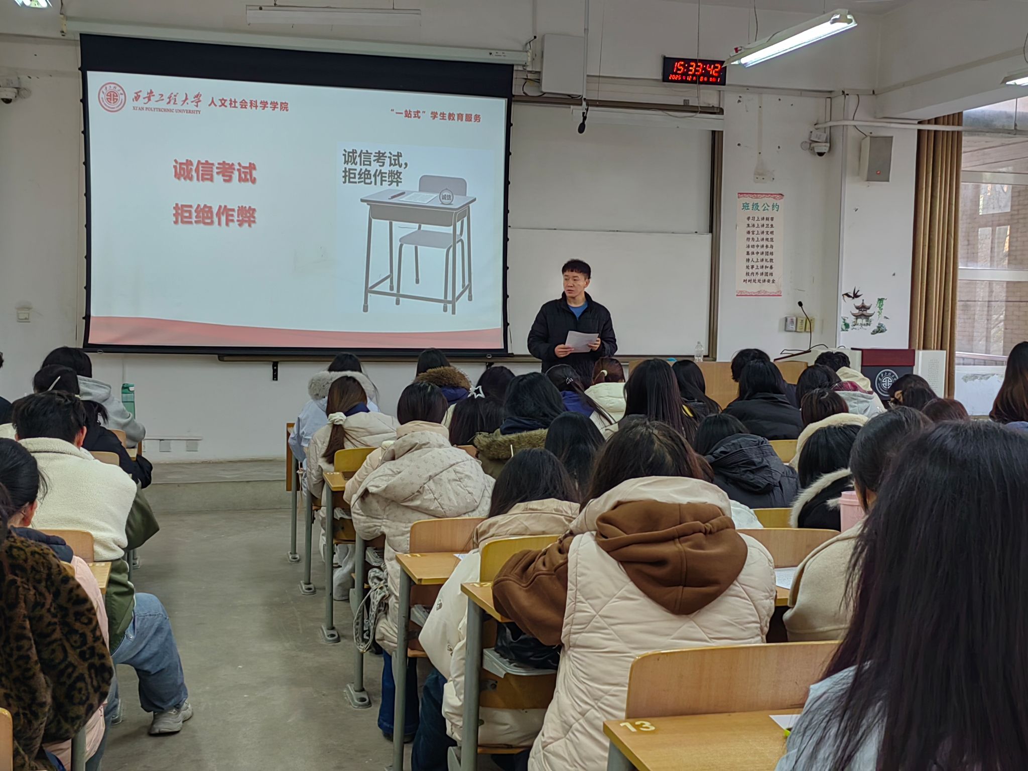 会议伊始,刘杨扬结合全国大学生英语四级考试及校内期末周考试临近的关键节点,重点强调诚信考试的核心意义。他告诫同学们切勿心存侥幸,详细阐释了考试违纪的严重后果,同时针对考前焦虑等问题,给出了科学的心态调整建议,引导大家以严谨态度和从容状态迎接考试。