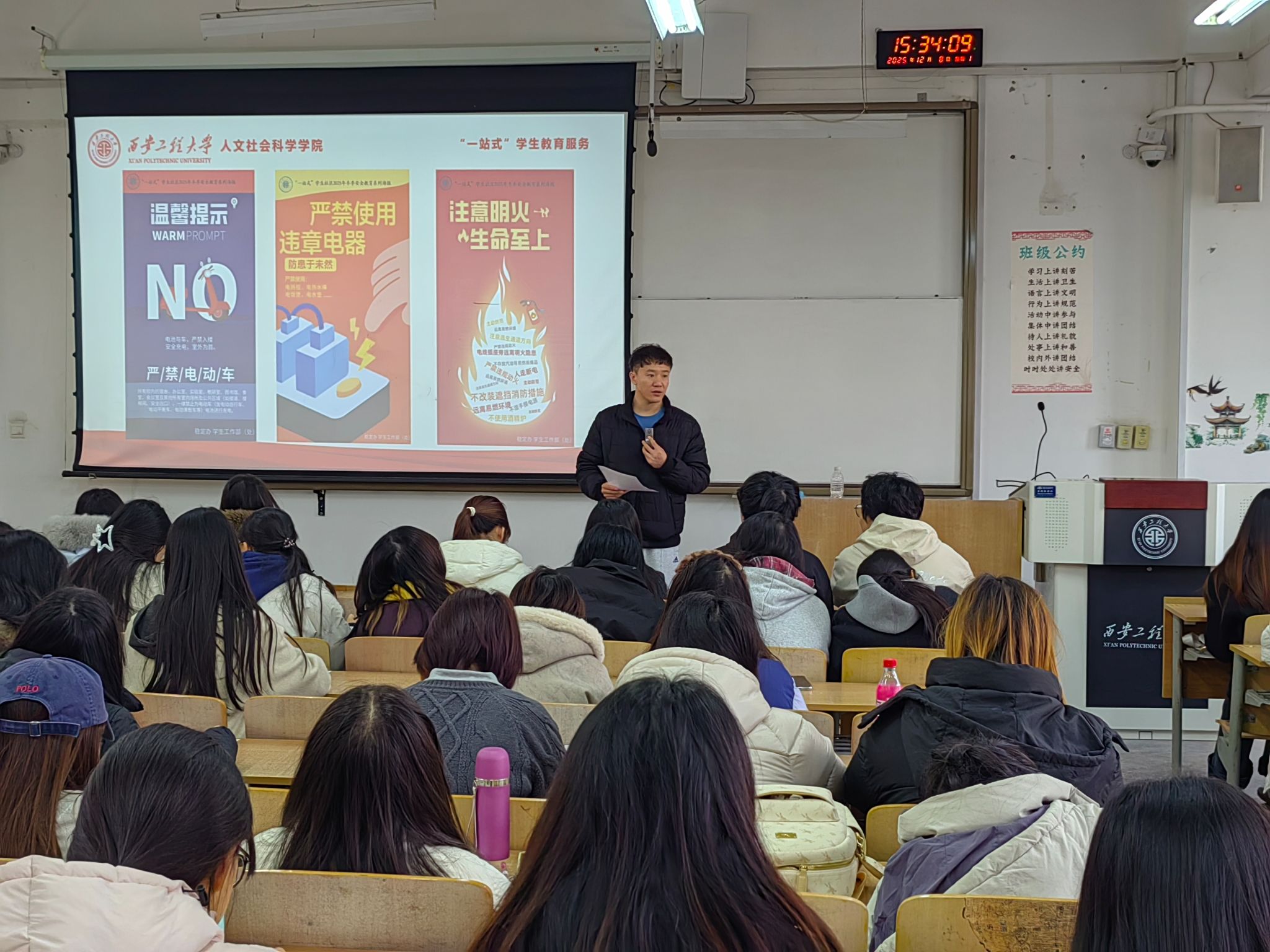 随后,刘杨扬围绕宿舍生活展开安全与人际关系指导。针对近期甲流频发的情况,他提醒同学们重视宿舍卫生清洁,做好健康防护;在安全管理方面,明确禁止使用大功率电器、电动车进宿舍充电等危险行为,强调要谨防明火隐患,筑牢宿舍安全屏障。此外,他还强调了和谐宿舍人际关系的重要性,鼓励同学们多沟通、善包容,及时化解矛盾,营造互助友爱的集体氛围。