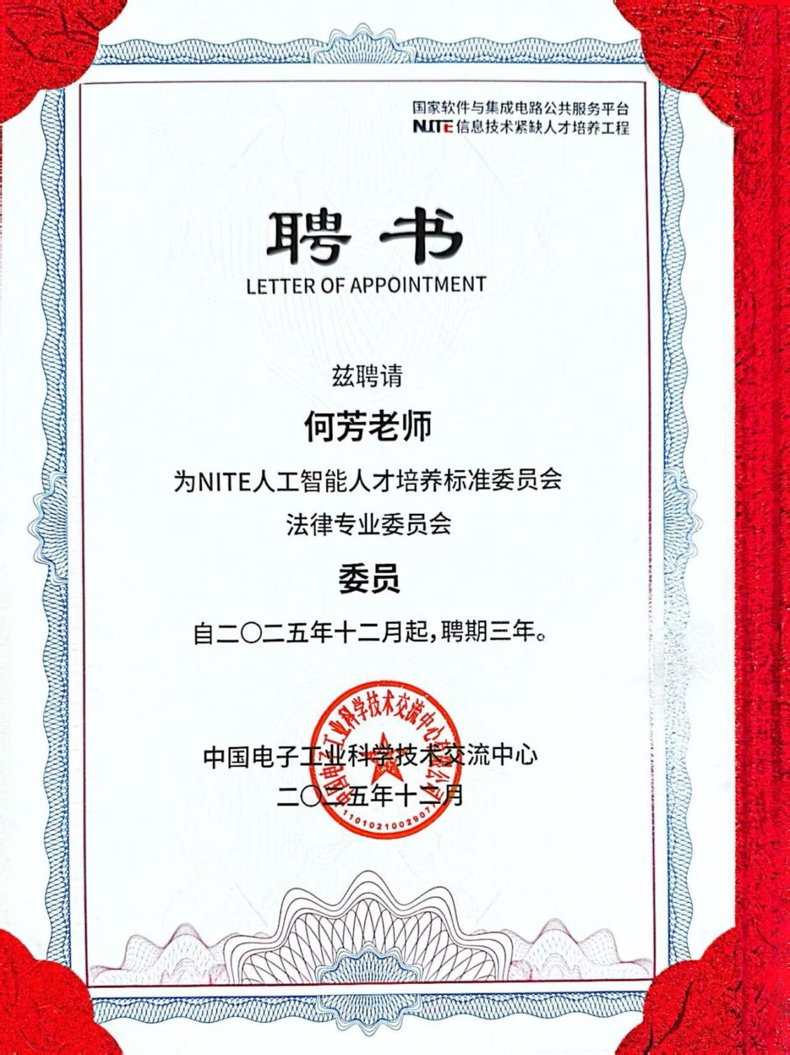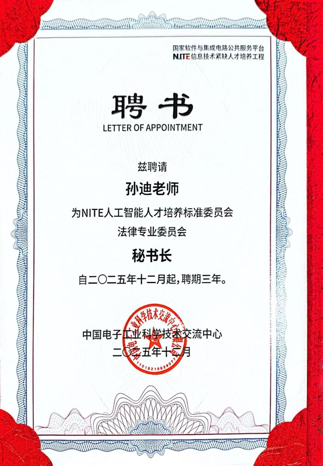 我集团suncitygroup太阳新城两位教师被聘为NITE人工智能人才培养标准委员会法律专业委员会秘书长和委员